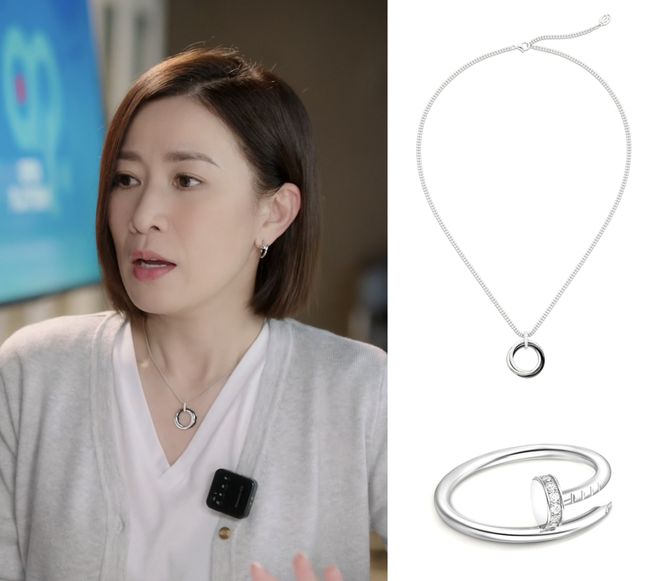 TiffanyKnot系列更是点睛一笔。她选择的是18K白金项链与耳钉,造型足够日常和低调,又有着刚柔并济的风格。而本身的“绳结”寓意,也象征着她在职场里与人的微妙关系,简直像是为她量身定制的。