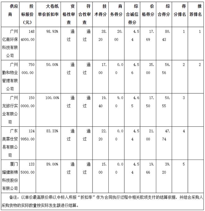 中标公告显示,共有5家企业参与了本次投标,报价折扣率在50%~100%之间。亿衡环保虽然价格不占优势,但仍凭借整体优势,以综合得分第一中标。